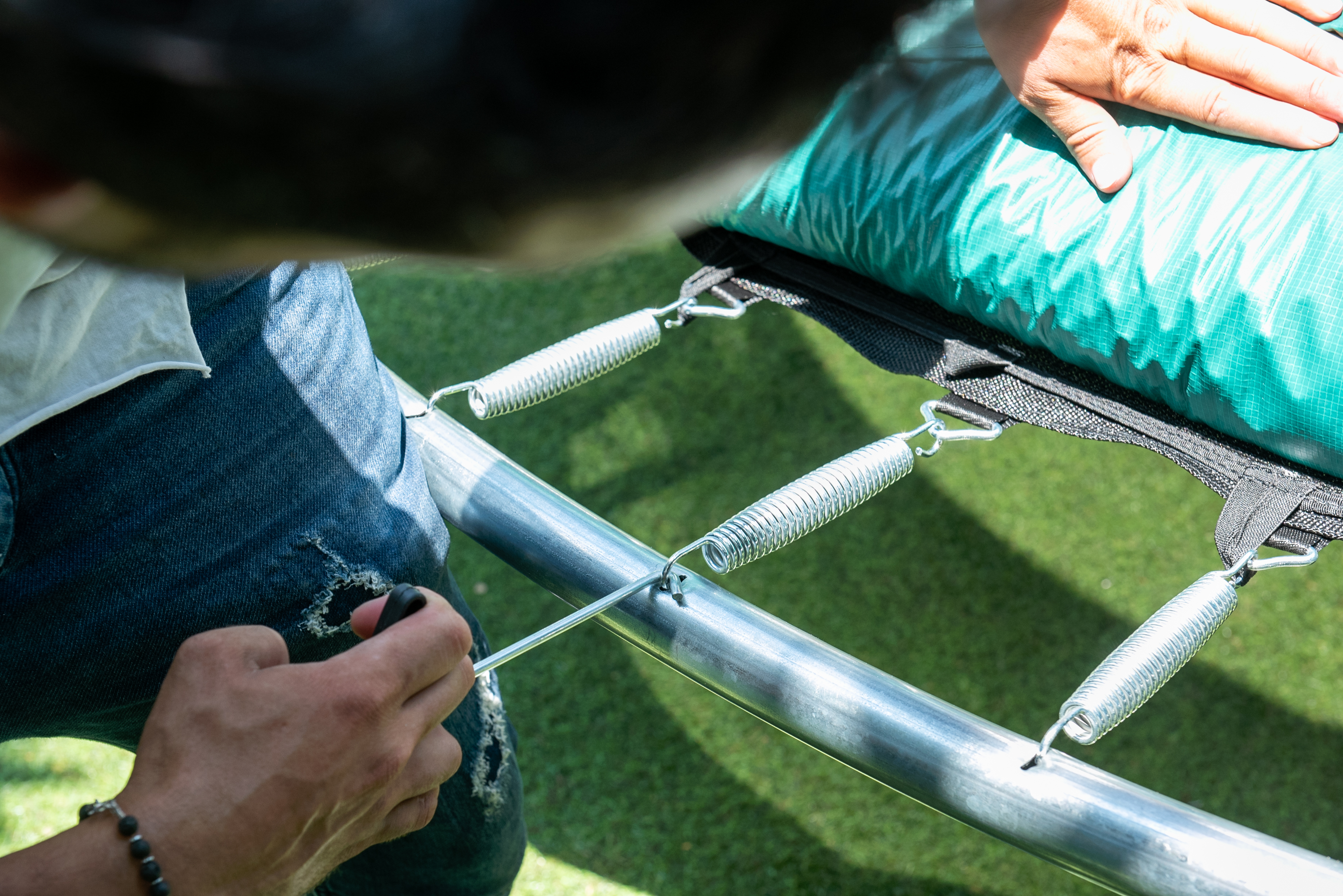 - מחברים את הכיסוי קפיצים . מניחים על הקצבות של הטרמפולינה ומחברים כל חור